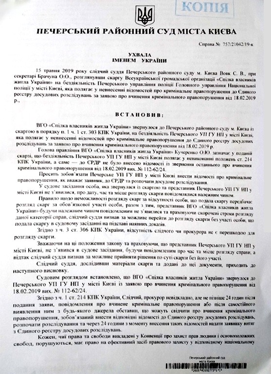 Ухвалою слідчого судді Печерського районного суду міста Києва від 15.05.2019, що розглянув скаргу ВГО “Спілка власників житла України”, зобов’язано компетентну посадову особу Печерського УП ГУНП у місті Києві внести відомості до Єдиного реєстру досудових розслідувань за заявою скаржника про вчинення кримінального правопорушення від 18.02.2019.