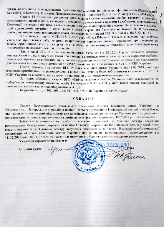 15.05.2019 слідчий суддя Печерського районного суду міста Києва С.В. Вовк, розглянувши зазначену скаргу ВГО “Спілка власників житла України”, ухвалив її задовольнити та зобов’язати компетентну посадову особу Печерського УП ГУНП у місті Києві внести відомості до Єдиного реєстру досудових розслідувань за заявою скаржника про вчинення кримінального правопорушення від 18.02.2019: