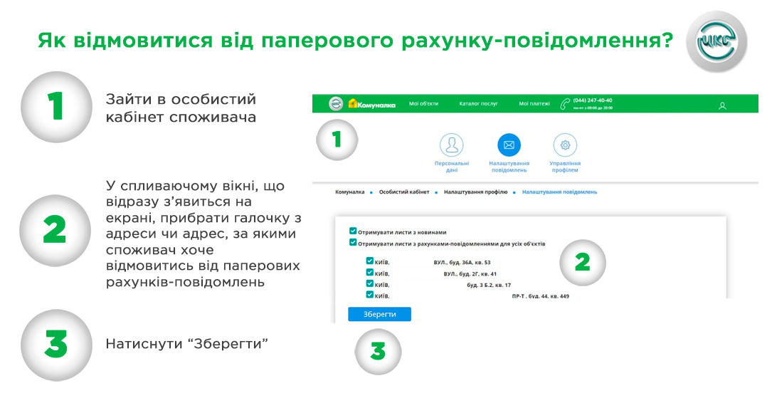 Відповідно до нормативно-правових актів та, зважаючи на численні звернення споживачів щодо відмови від отримання паперових рахунків-повідомлень, ЦКС розробило технічну можливість отримувати такі рахунки в електронному вигляді в особистому кабінеті споживача.