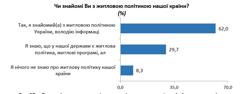 Загалом учасники опитування добре поінформовані щодо житлової політики нашої держави: 62% у своїх відповідях зазначили, що ознайомлені з житловою політикою України й володіють інформацією щодо чинних житлових програм.