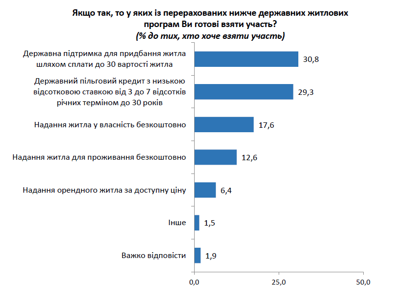 Як позитивний факт варто відзначити зменшення патерналістських настроїв серед українців: лише 9,2% опитаних вважають першочерговим завданням держави у сфері житлової політики надання житла у власність безкоштовно. Понад 7% бачать пріоритетним напрямом надання житла в оренду на пільгових засадах. На думку більшості опитаних (63,6%), для забезпечення громадян житлом держава повинна насамперед організувати іпотечне кредитування під низьку відсоткову ставку.