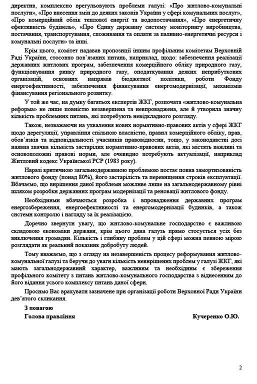 З огляду на зазначене, СВЖУ вбачає необхідним збереження комітету з питань житлово-комунального господарства у Верховній Раді України дев’ятого скликання з віднесенням до його відання усього комплексу питань даної сфери, що надасть можливість їх ґрунтовного та всебічного розгляду.