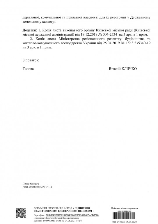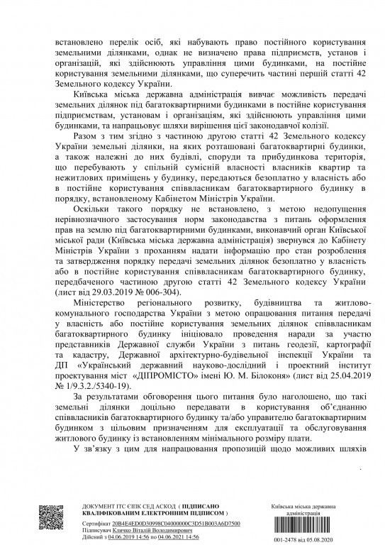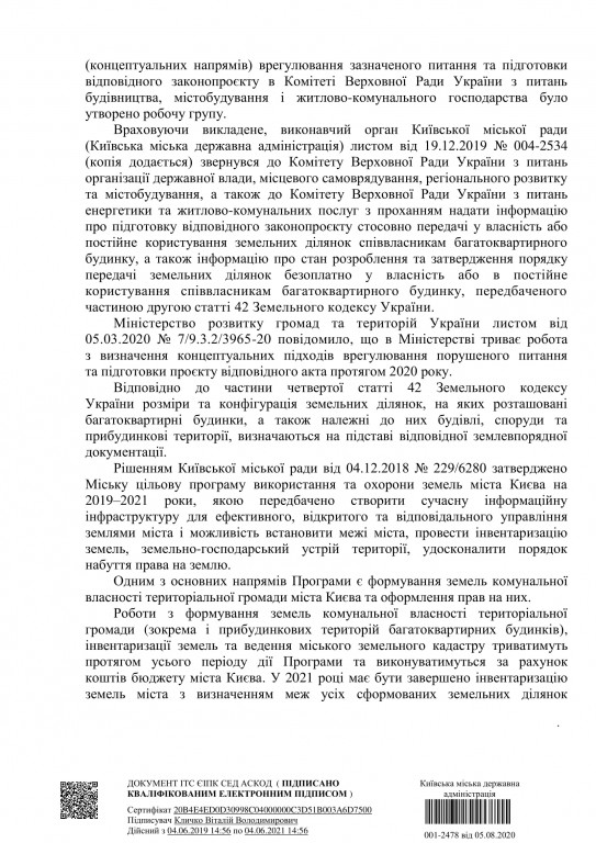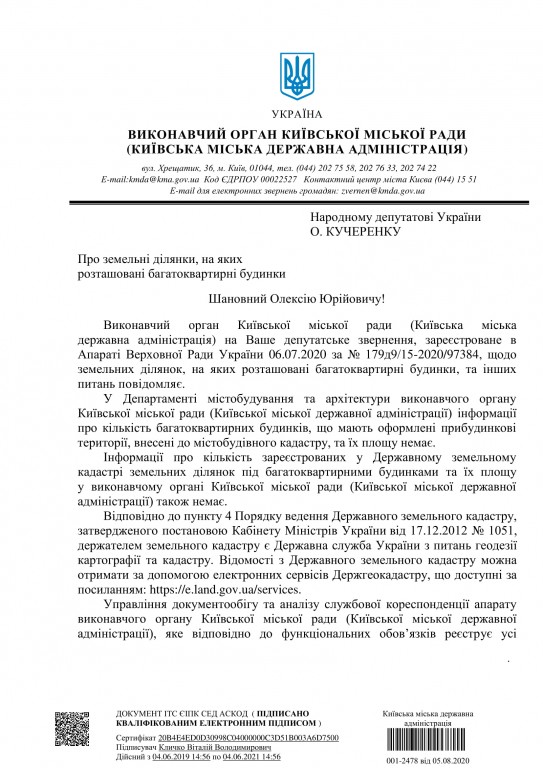 05.08.2020 виконавчий орган Київської міської ради (Київська міська державна адміністрація) листом № 001-2478 надав відповідь на звернення.