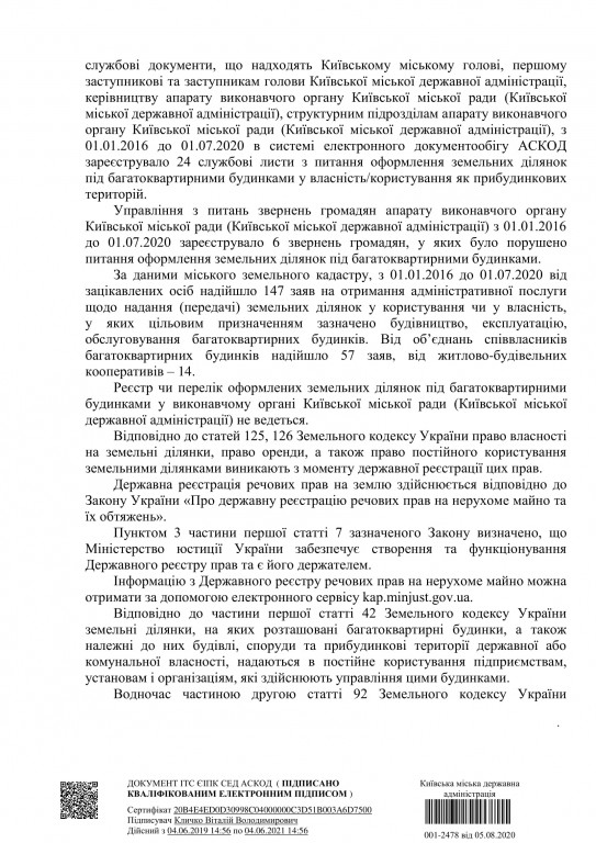Зокрема, у зазначеному зверненні було поставлене питання щодо кількості багатоквартирних будинків у Києві, які мають оформлені прибудинкові території, що внесені до містобудівного (1) чи земельного (2) кадастру.